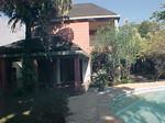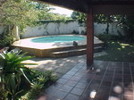 Casa em centro de terreno, jardins, piscina e churrasqueira. Salão diversos ambientes, lavabo, escritório, copa com pia, cozinha planejada, área de serviço, garagem, banheiro e duas dependências com banheiro.