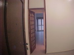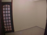 Entrada da sala com porta blindex e outra de madeira. Piso claro cerâmico.