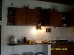 Sala, cozinha americana com armários embutidos, banheiro completo e quarto.
