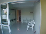 Cozinha com acessórios, banheiro com box e chuveiro elétrico, sala com nicho para TV e varanda com toldo e vista panorâmica da enseada.