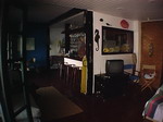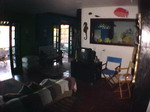 Nível do meio: sala ou copa com churrasqueira, lavabo, salão em L acoplado à cozinha. Varanda com vista panorâmica da enseada.