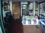 Nível inferior: sala ou dormitório com duas camas, dois quartos e banheiro completo. Saída para área de lazer do condomínio.